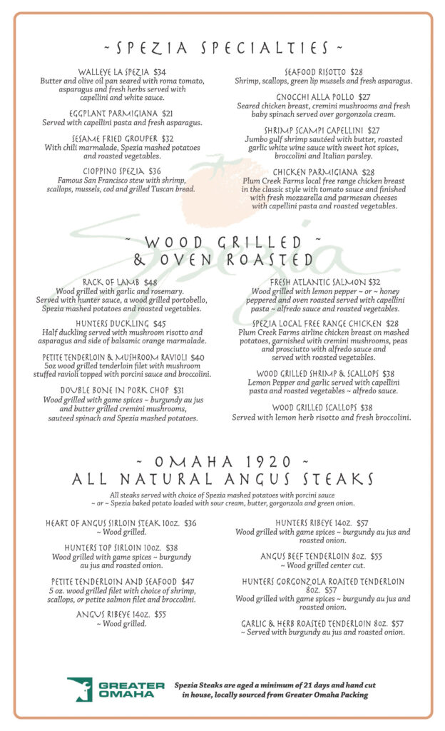 Spezia Steaks are aged to a minimum of 21 days and hand cut in house, locally sourced from Greater Omaha Packing.